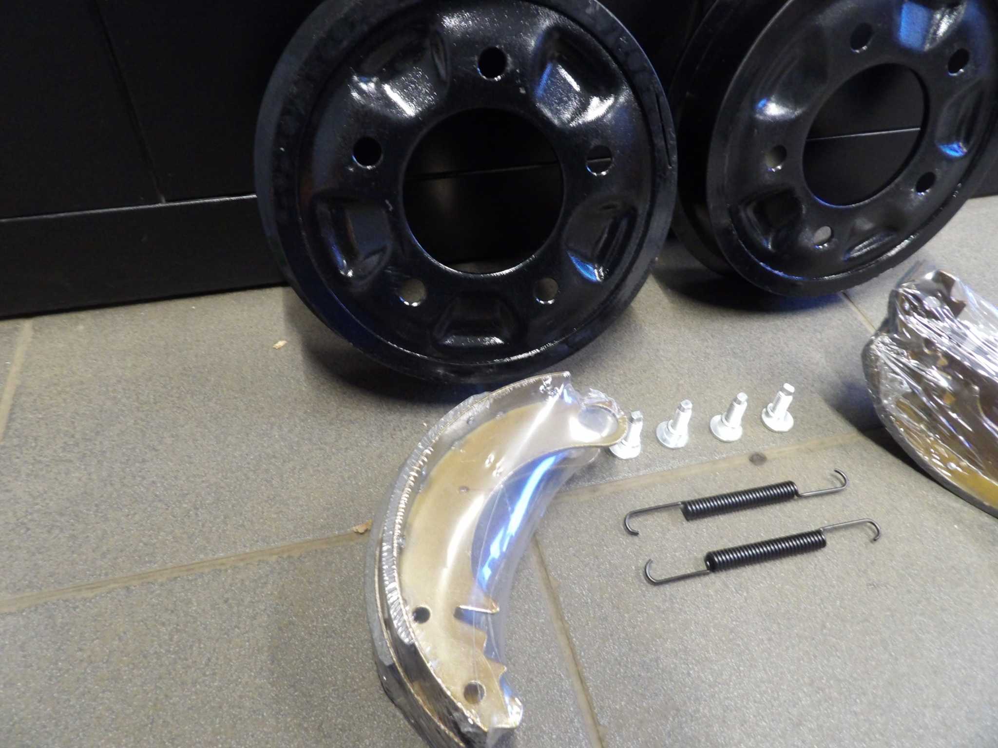 De set bevat; 2x remtrommel, 2 remschoen sets, 4 excentrische bouten en 2 veren.